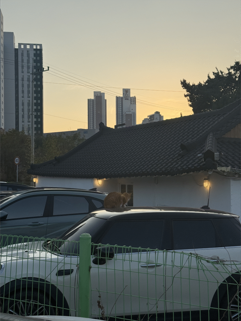 그 앞에 주차된 차들 사이로 고양이 한 마리가 차 지붕 위에서 쉬고 있는 모습이 눈에 들어왔습니다.