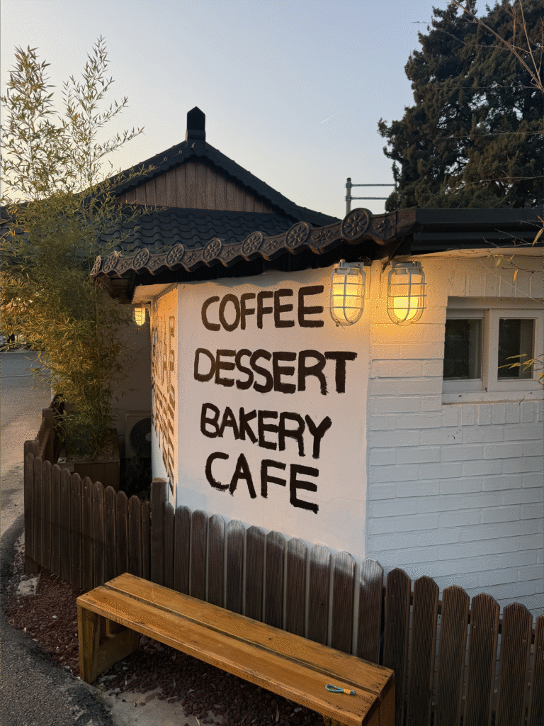고매커피는 낮은 기와지붕에 하얀 벽, 그리고 긴 현수막 간판이 인상적인 카페였습니다.
