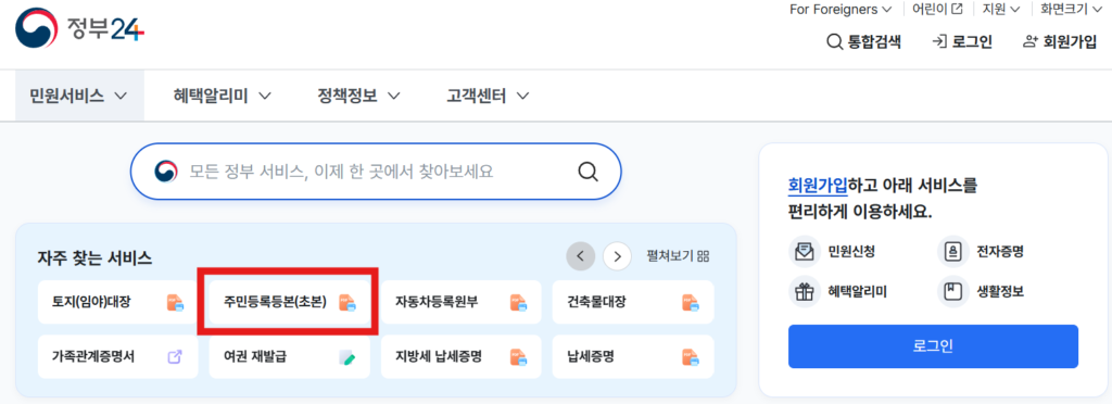 - ‘주민등록표등본(초본) 발급’ 서비스 선택