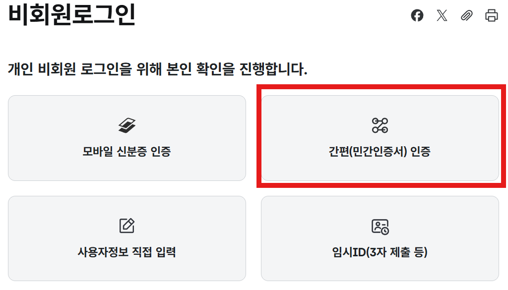정부24 모바일 웹 또는 앱을 통해서도 주민등록등본 인터넷발급 신청은 할 수 있습니다. 로그인 방식 역시 공동인증서나 금융인증서를 사용합니다. 다만 다음과 같은 한계가 있습니다.