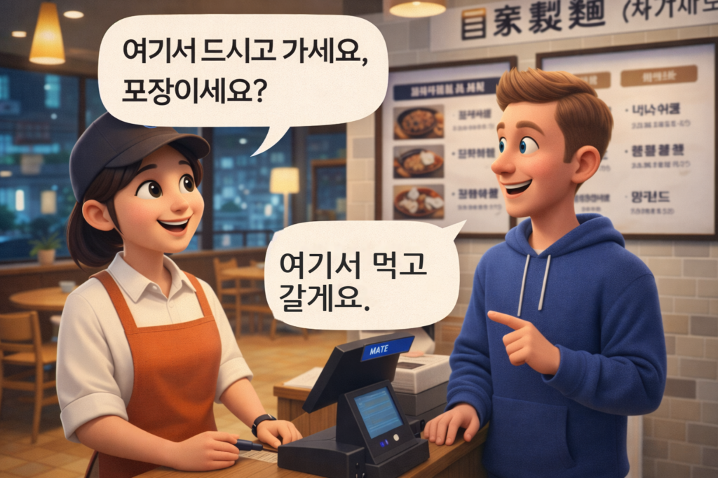 Staff: 여기서 드시고 가세요, 포장이세요? (For here or to go?)