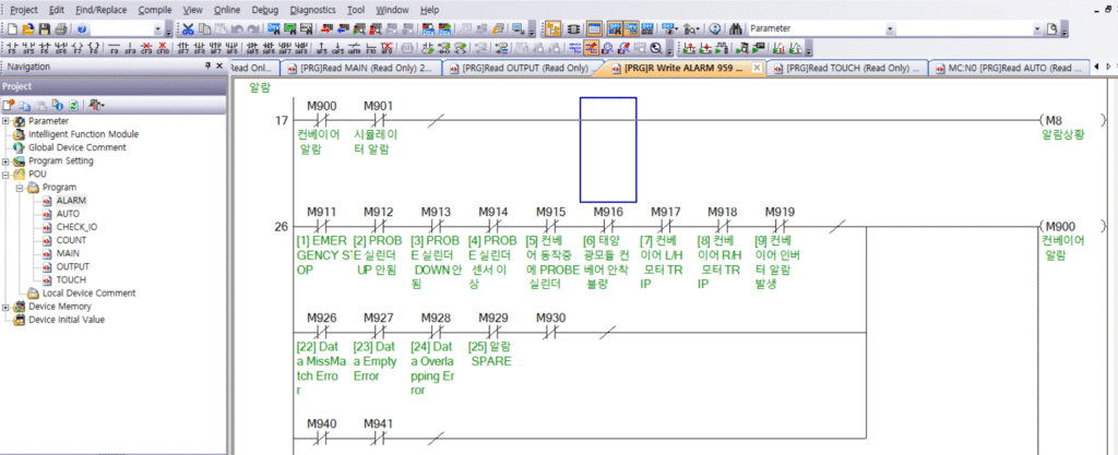 - Mitsubishi 전용 개발 소프트웨어를 이용해 래더를 작성하고, 시뮬레이션 기능으로 기본 동작을 확인합니다.